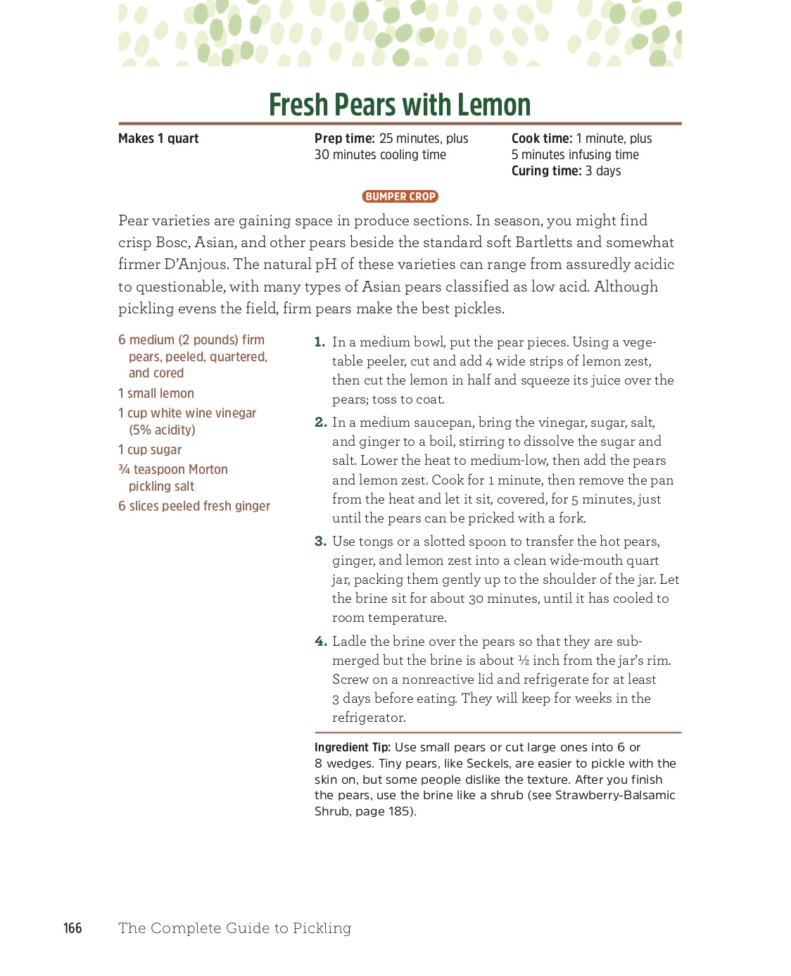 I feature many fresh pickles in The Pickled Picnic: Cocktail Onions land in a Briny Gibson, pickled and canned beans let you make Pickled Three-Bean Salad any time of year, and Apple-Sweetened Yellow Onions, Pickled Garlic Cloves, and Pickled Chive Blossoms all make tasty additions to Pickle-Topped Pizza. I particularly enjoyed finding ways to use sweet and fruity pickles and their brines. The pear recipe I shared here works beautifully in Pickled-Fruit Salsa, perhaps mixed with pickled sour cherries or mango, and is a unique and delicious pizza topping. Sweet-and-Tart Blueberries sit well on bruschetta, and brine from Jerk-Spiced Banana Pickles or Pickled Pineapple can glaze crispy tofu.