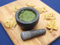 Once I had several batches of freshly pounded pesto, I also couldn’t resist trying my hand at scratch-made pasta. With some tips and tricks—and a hand-cranked, countertop pasta maker—homemade pasta turned out to be far less messy and far less difficult than I had anticipated, with tasty results that paired perfectly with creamy, mortar-pounded pesto.